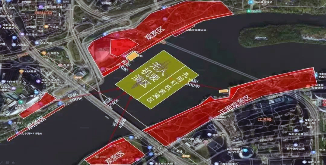 無人機(jī)表演位置位于盛京大劇院南側(cè)河面上空,渾河兩岸均可觀賞。根據(jù)無人機(jī)空中圖像位置和高度,建議觀賞區(qū)域如下:1. 渾河南岸由渾河大橋以東至南洋碼頭區(qū)間;2. 渾河北岸由渾河大橋以東至秦開像南面的觀景臺(tái)區(qū)間;3. 渾河大橋以西南北兩岸距渾河大橋500米以內(nèi)區(qū)間。